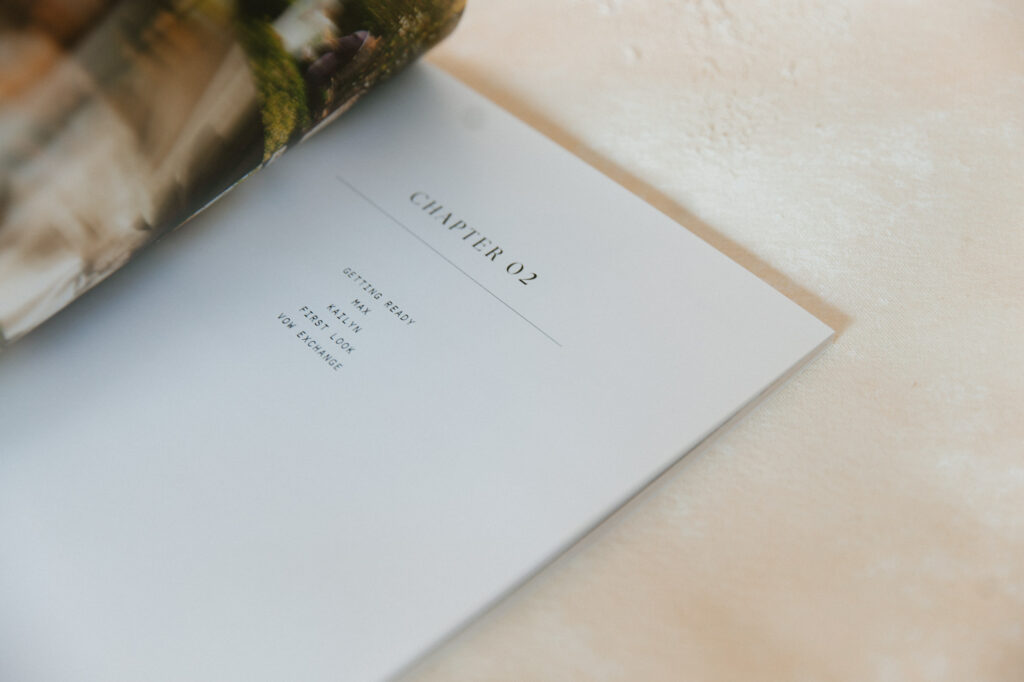 I divide the magazine into sections, starting with your engagement session (if we’ve done one together), followed by each part of the day. This is different for every wedding day, because some are pretty eventful. Not every magazine will have an “after party” section, but most will have “getting ready” and all of them will have “ceremony”.
